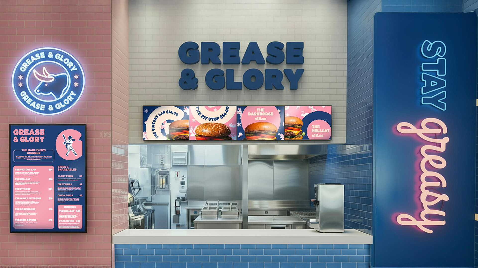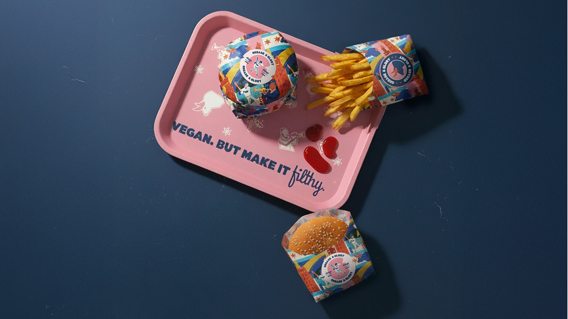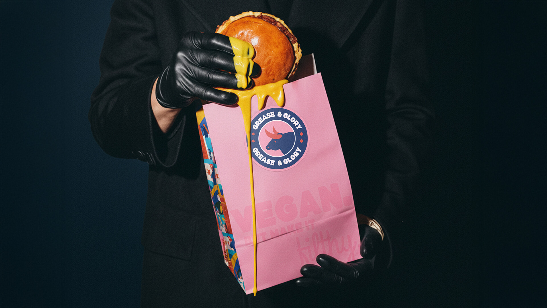 Айдентика Grease and Glory, разработанная StudioZak, демонстрирует редкий для сегмента веганского фастфуда отказ от ожидаемой визуальной риторики. Вместо привычных зелёных оттенков, образов листьев и «здоровых» ассоциаций бренд сознательно выбирает язык жирной, громкой и откровенно гедонистической еды. Это визуальный манифест против стереотипов — и одновременно точное попадание в аудиторию, уставшую от однотипного «эко»-дизайна.
