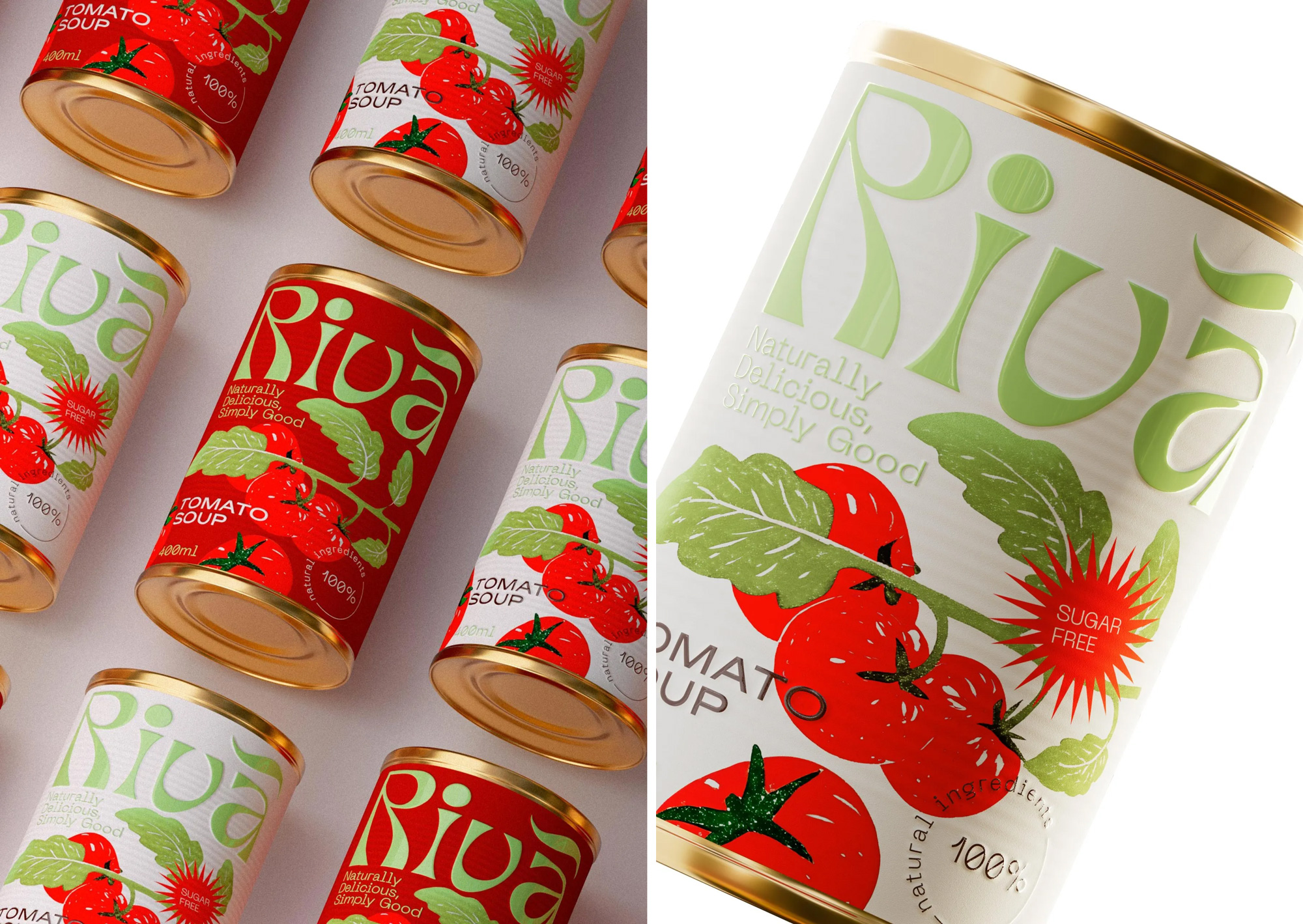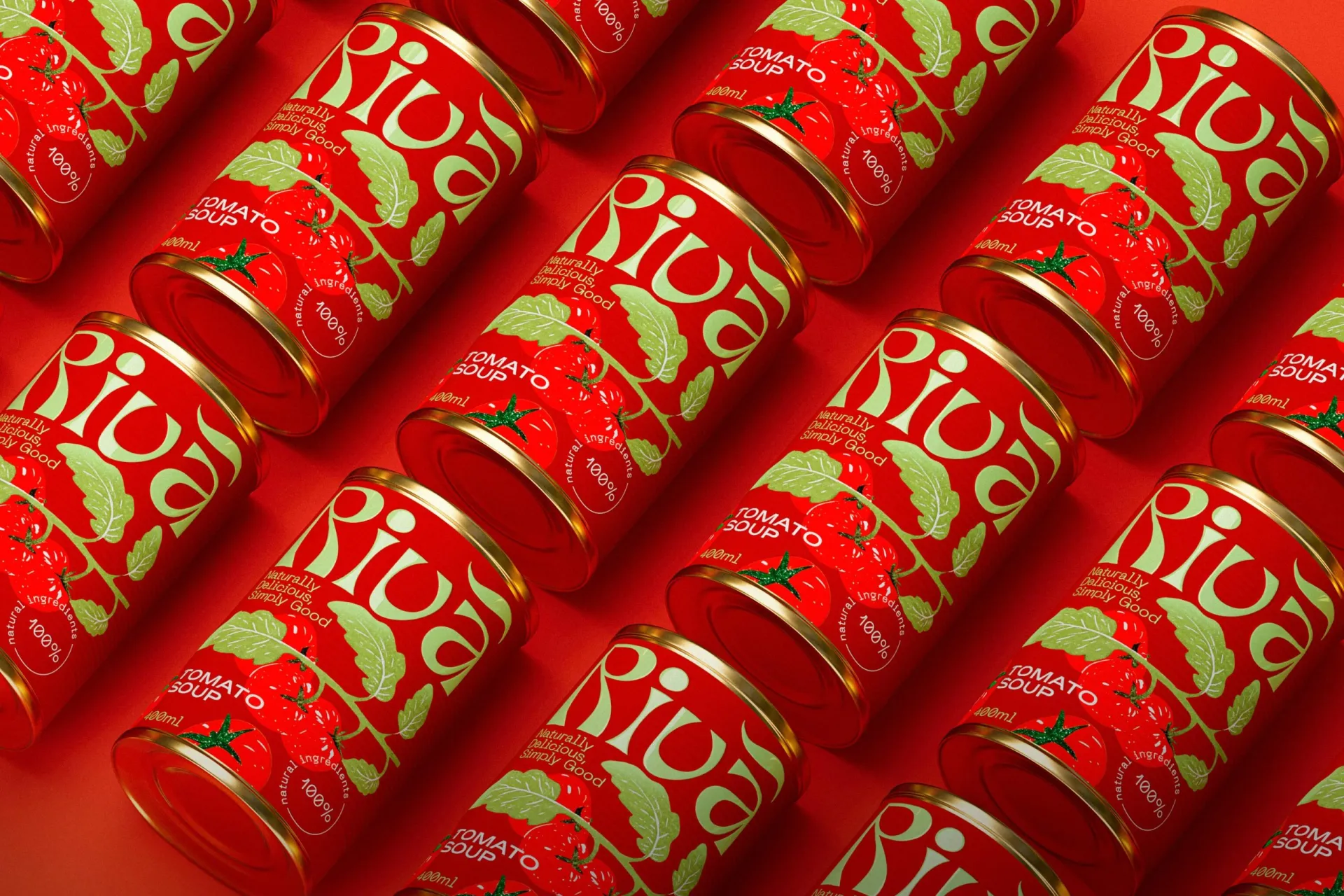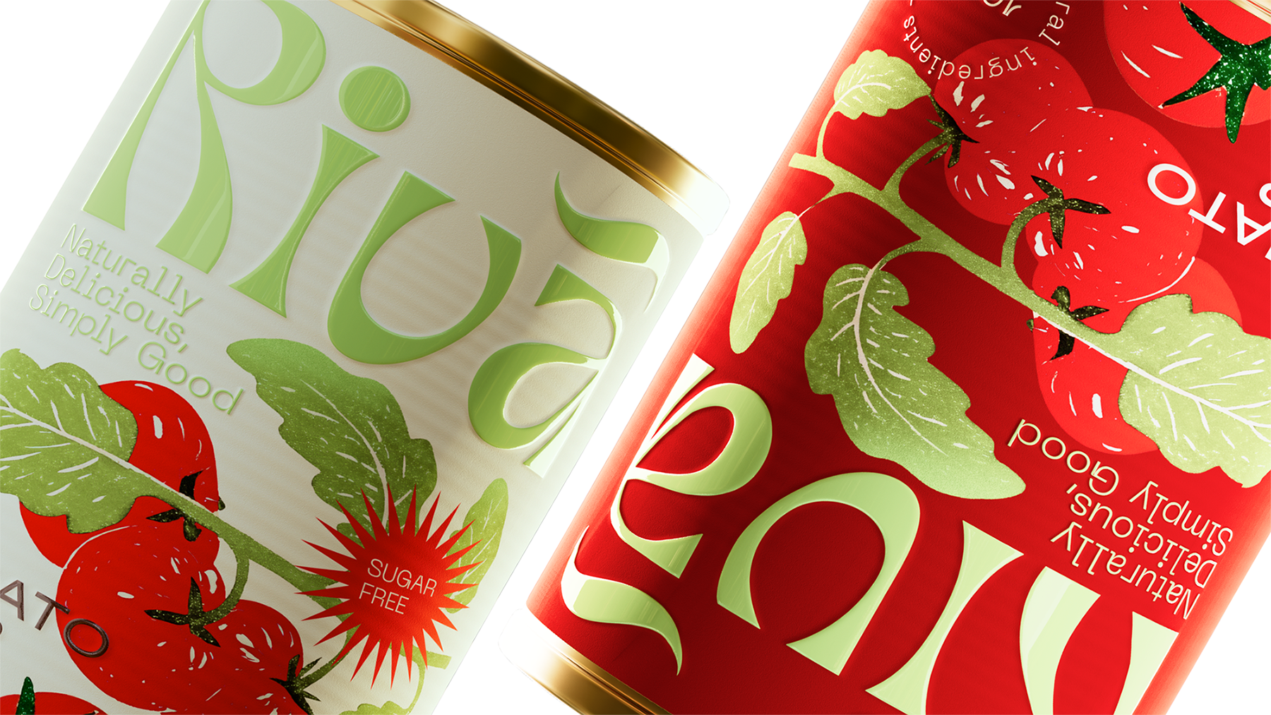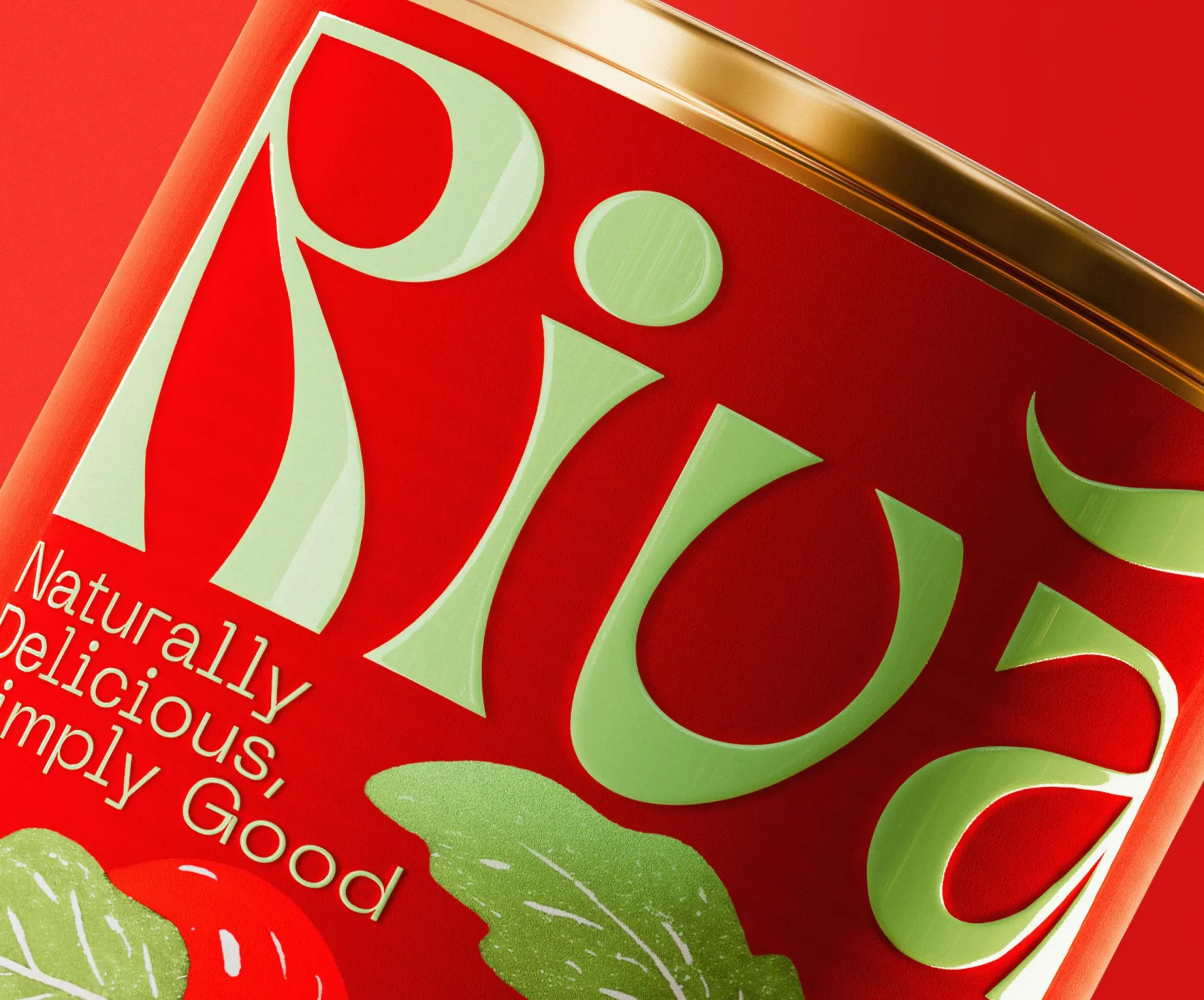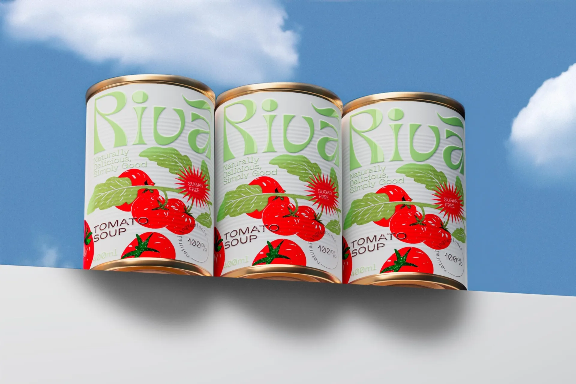 Айдентика и упаковка Riva построены на насыщенном красном фоне, который усиливает заметность на полке, тогда как крупная, текучая типографика формирует выразительный и современный голос бренда. Иллюстрации томатов с зелёной ботвой добавляют ощущение свежести и доступности, уравновешивая графическую интенсивность природными акцентами. Золотые крышки банок создают деликатный премиальный контраст с плоской цветовой палитрой. В целом концепция объединяет энергию, ясность и запоминаемость, позиционируя Riva как современный базовый продукт для кухни с выразительным и мгновенно узнаваемым брендингом.