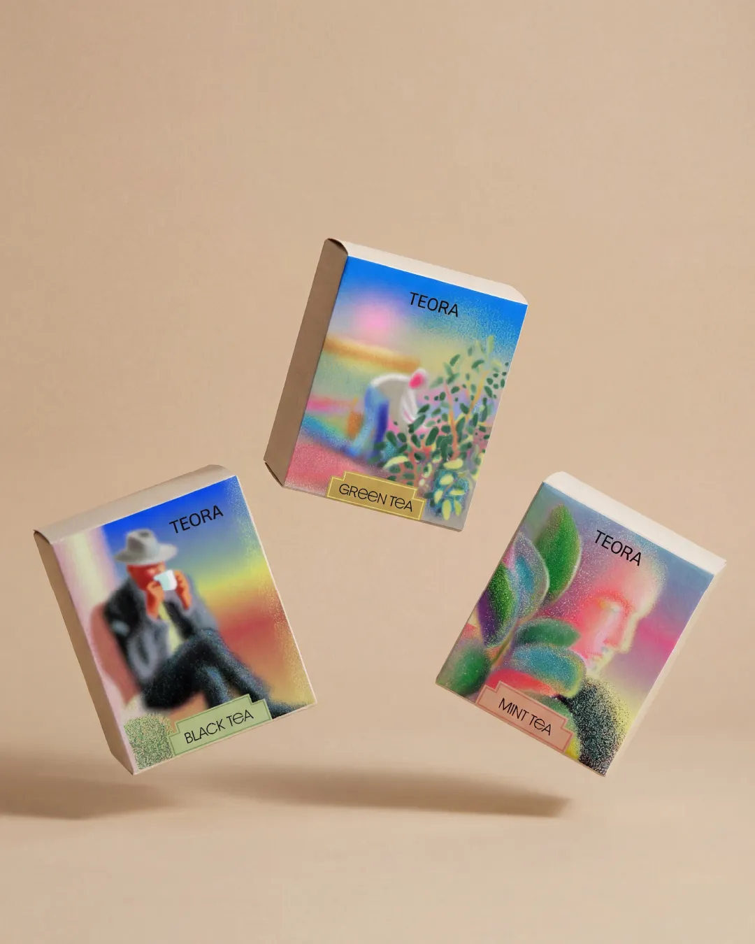 Каждая упаковка представляет отдельный сорт чая — зелёный, чёрный и мятный. Различия между ними переданы через цветовые решения и композицию, формирующие индивидуальное настроение, при этом вся серия сохраняет цельную визуальную идентичность.