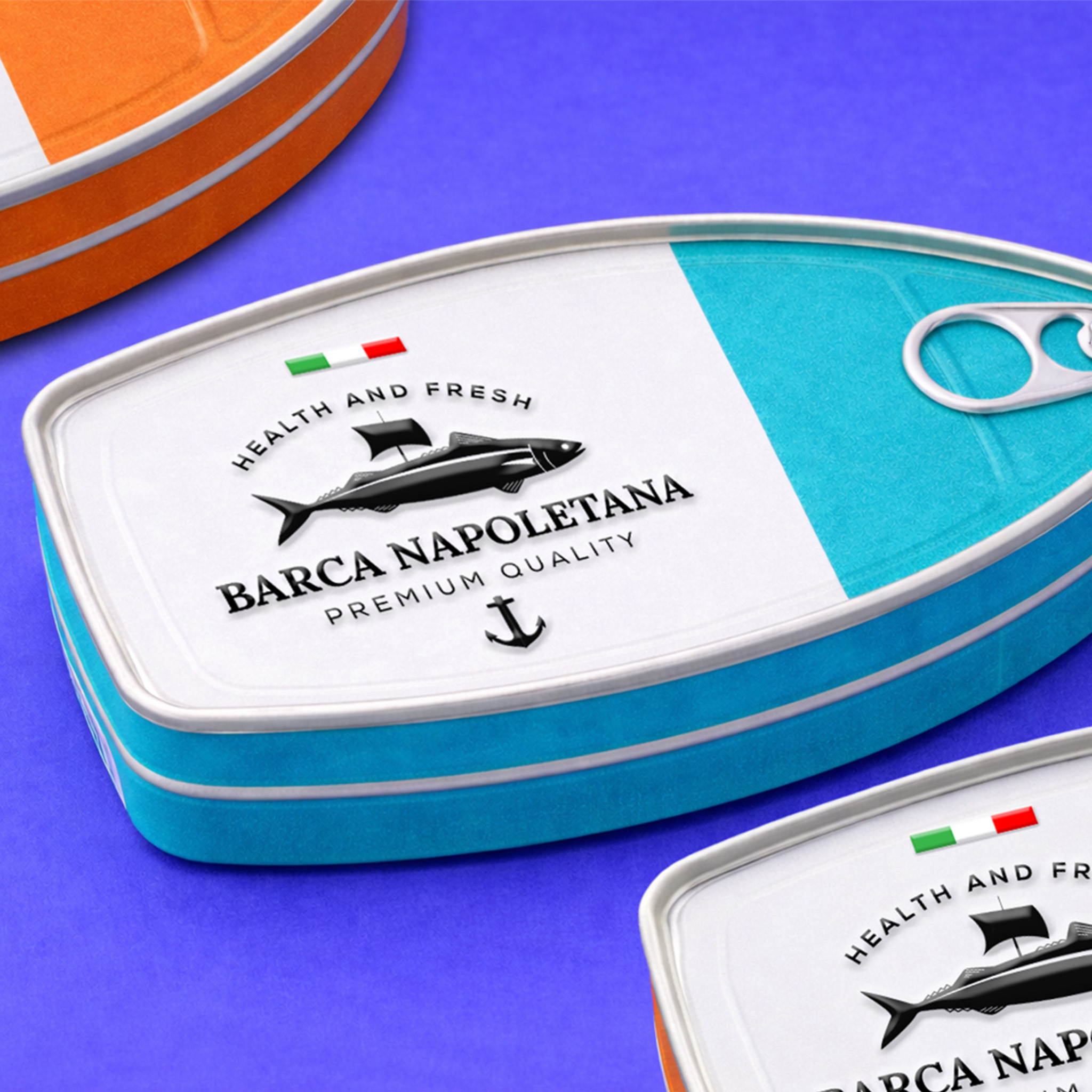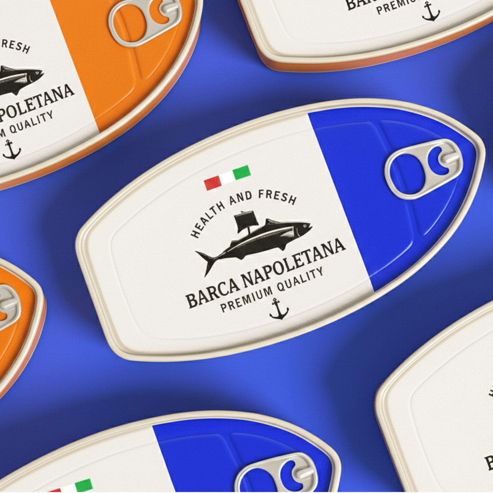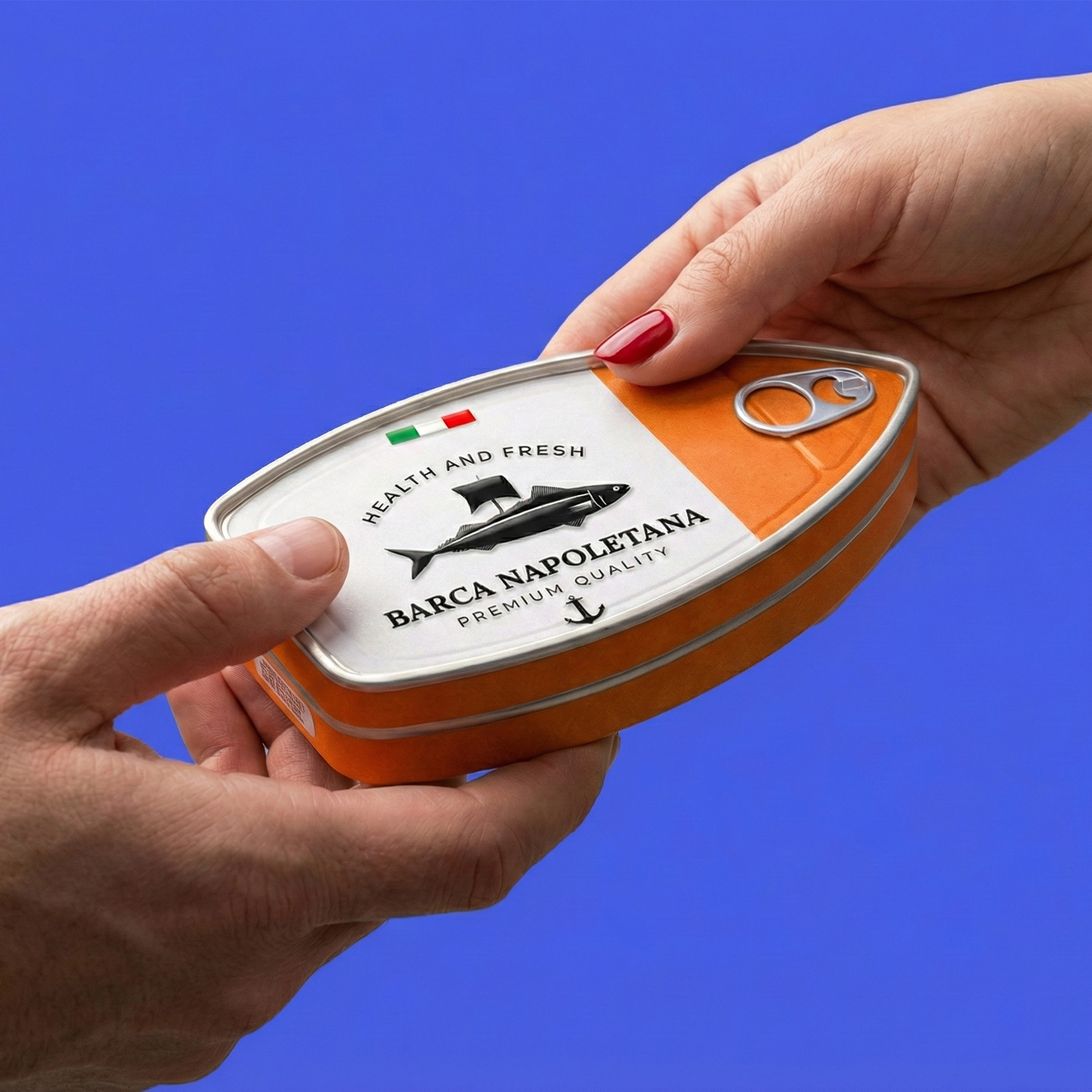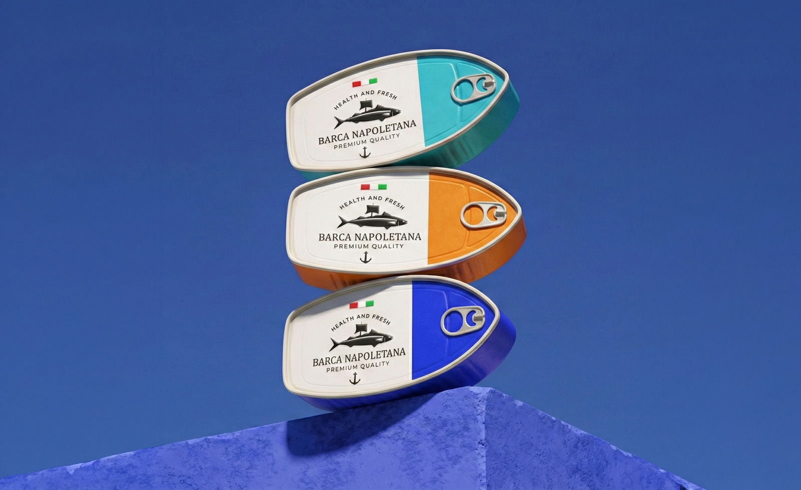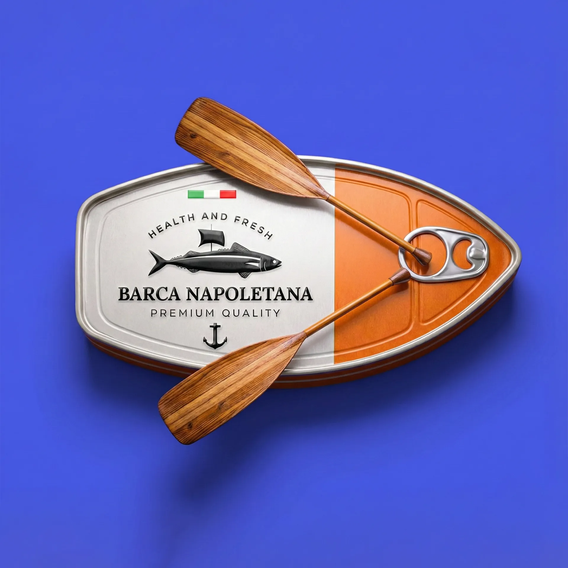 Упаковка консервированной рыбы «BARCA NAPOLETANA» от Atyan Design основана на четкой идее: море, путешествия и итальянское качество. С первого взгляда привлекает внимание уникальная форма: упаковка напоминает очертания лодки, что создает прямую связь с названием бренда («Barca» – лодка) и морскими корнями.