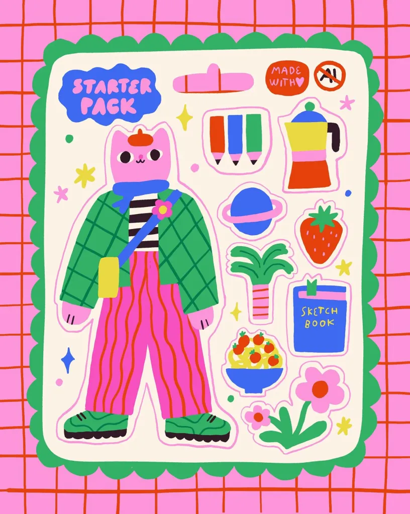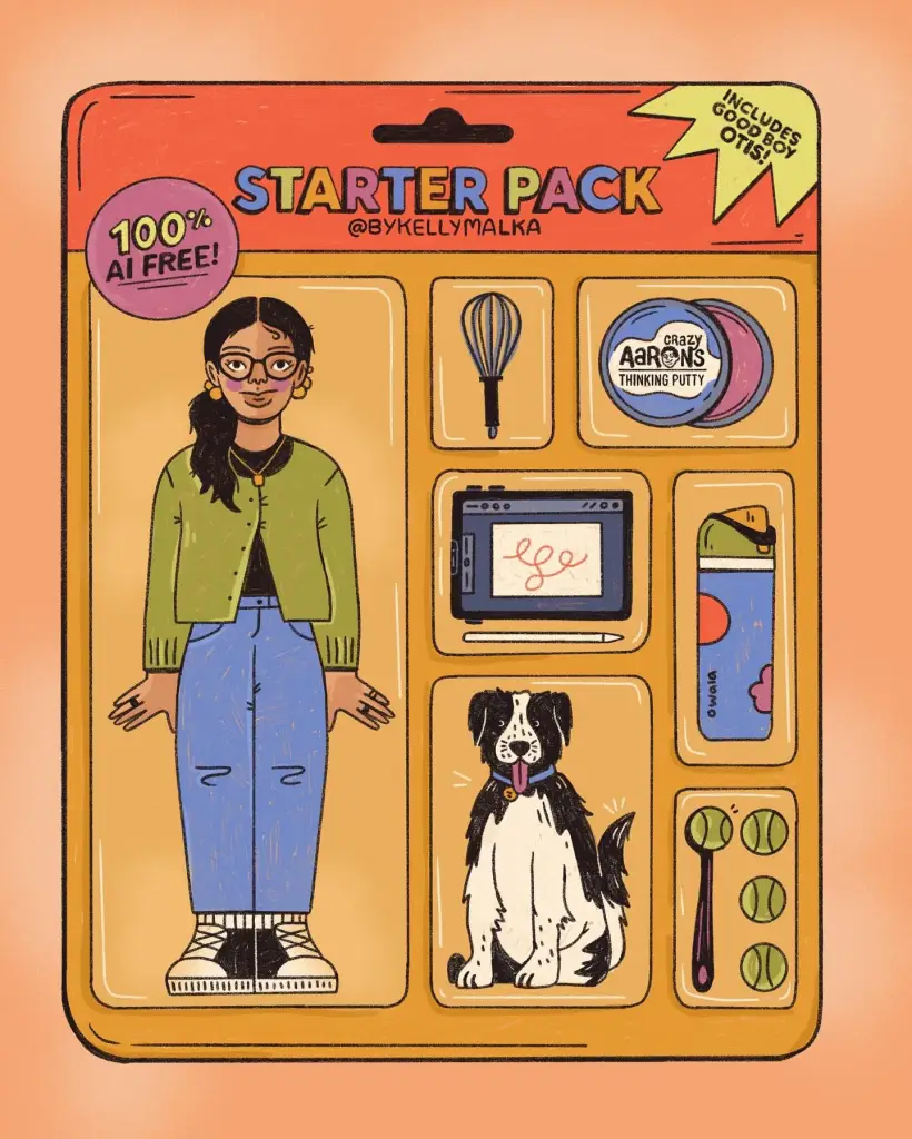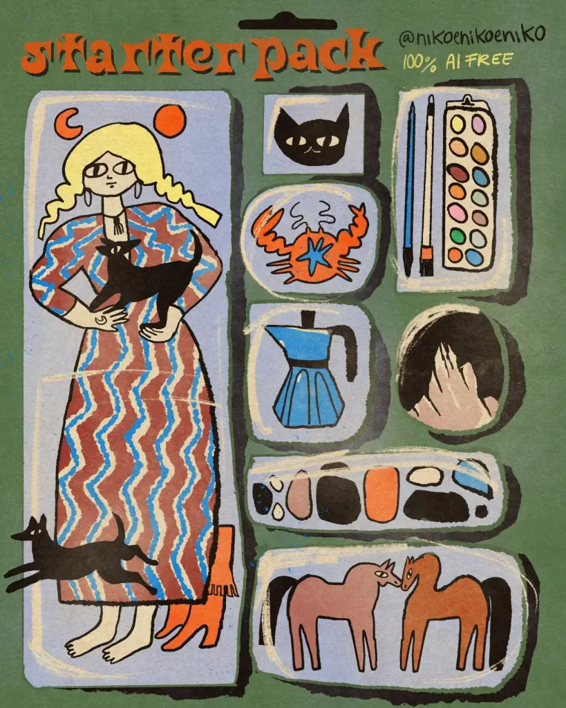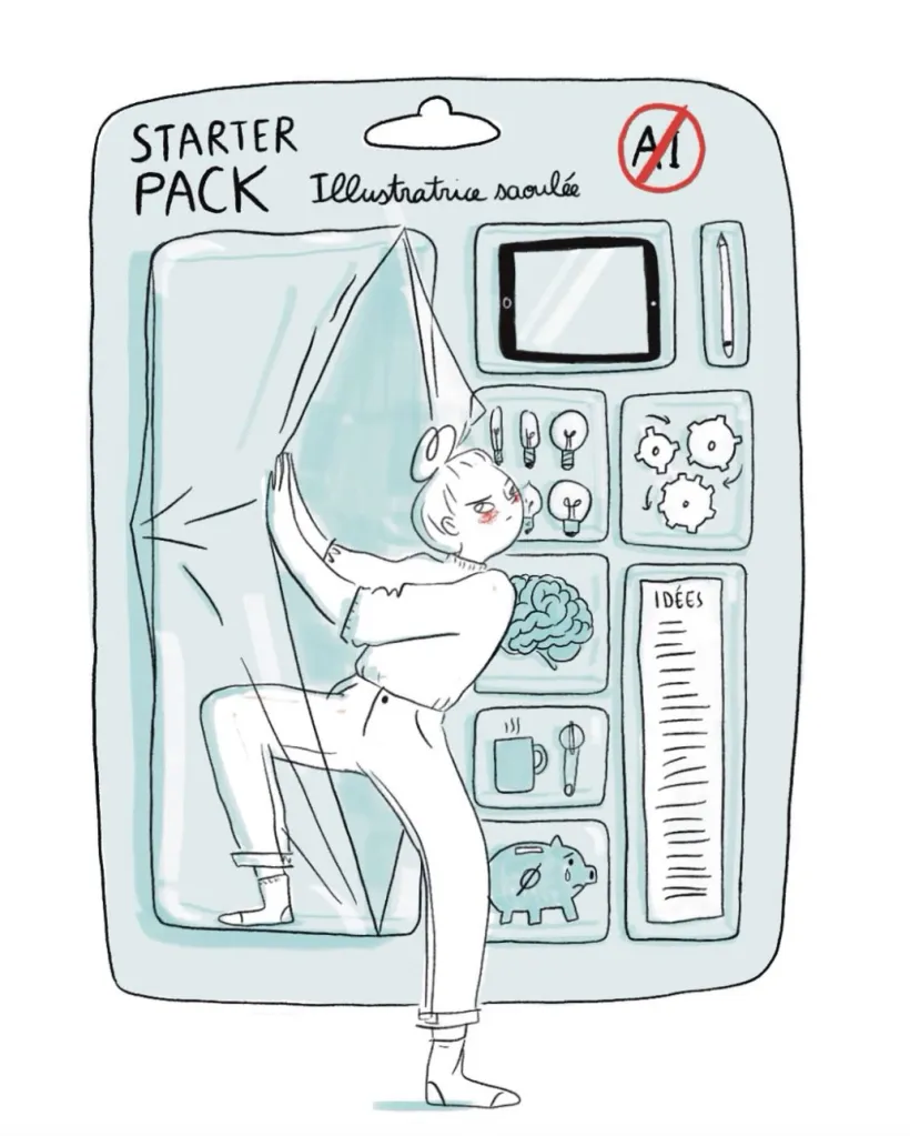 Вдохновленные челленджем #starterpackNoAI от французских иллюстраторов Гаэтана Габриеля, Пенелопы Баглё и Патуре, художники-иллюстраторы со всего мира начали создавать и делиться своими собственными чудесными «стартовыми пакетами» в стиле Obvious Plant в знак протеста против генеративного ИИ.