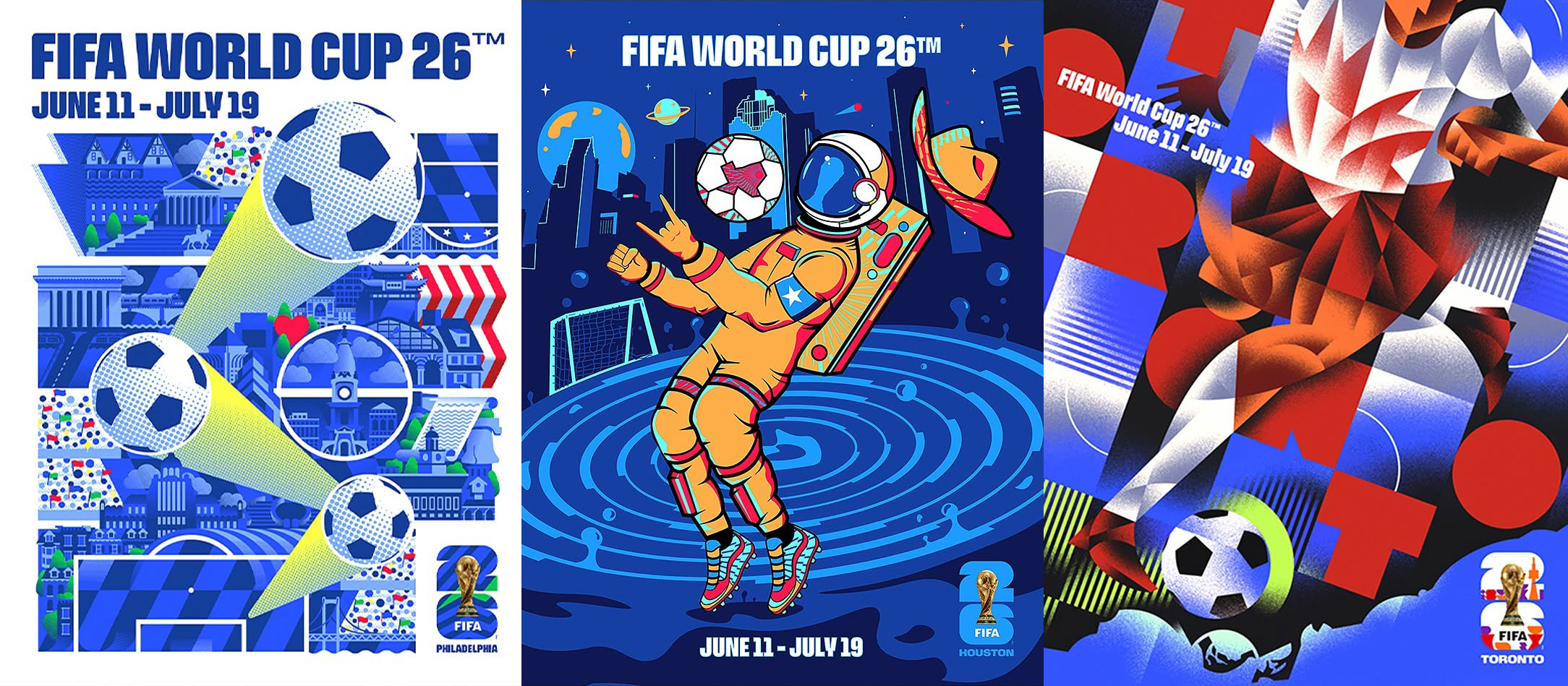 В Сиэтле дизайнер Сёго Ота изобразил косатку, символизирующую связь города с морем и природой. В Бостоне Джон Рего представил лобстера-судью, отсылая к морским традициям региона. Хьюстонский плакат, созданный Стефани Леал, изображает астронавта, играющего в футбол на фоне городского пейзажа, подчёркивая аэрокосмическое наследие города. Мехико, Гвадалахара и Монтеррей объединили усилия с иллюстратором Cuemanche, представив яркие постеры, насыщенные фольклорными мотивами. Торонто в интерпретации Дэйва Мюррея предстает в кубистическом стиле, отражающем мультикультурную сущность города.