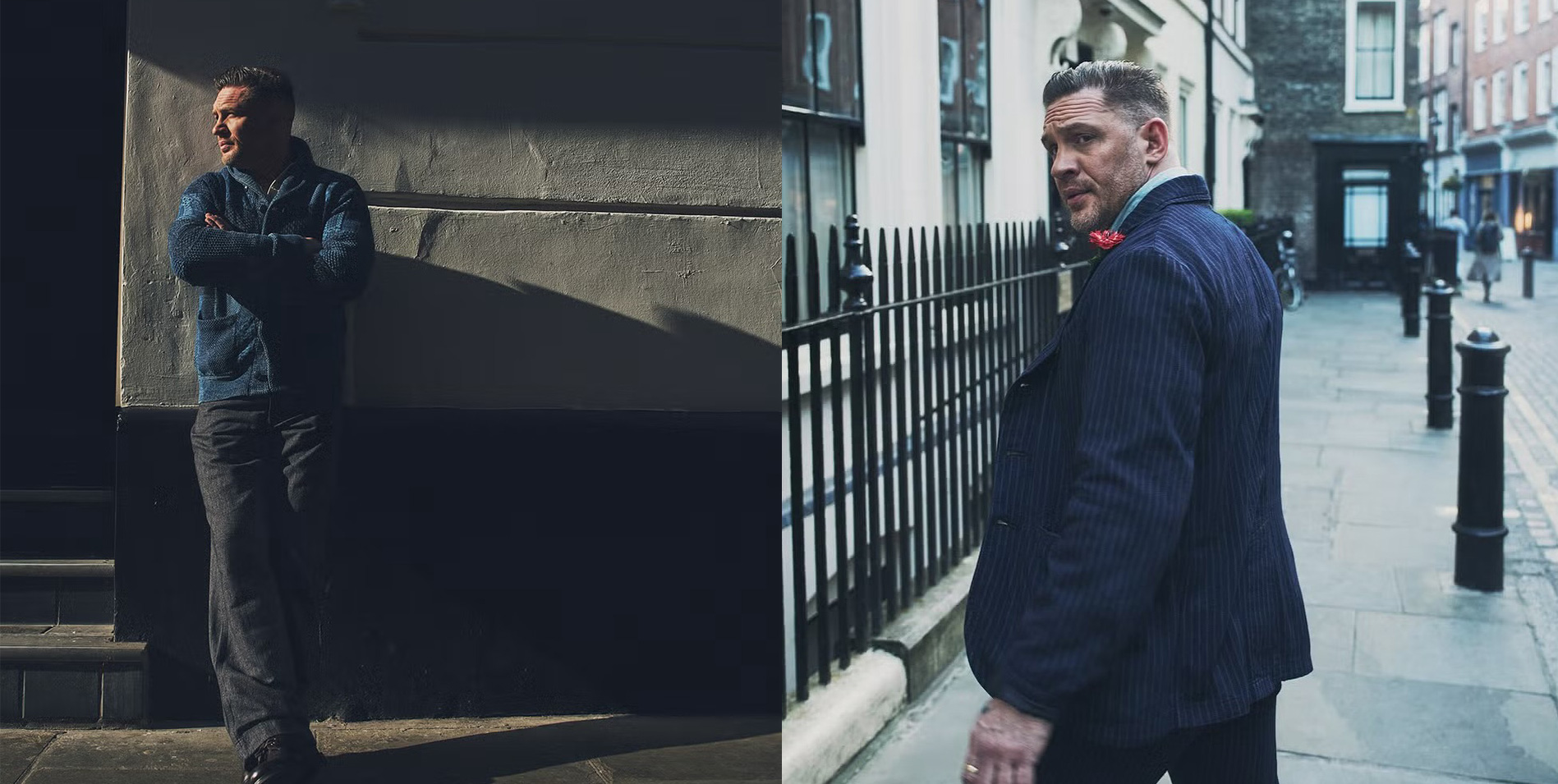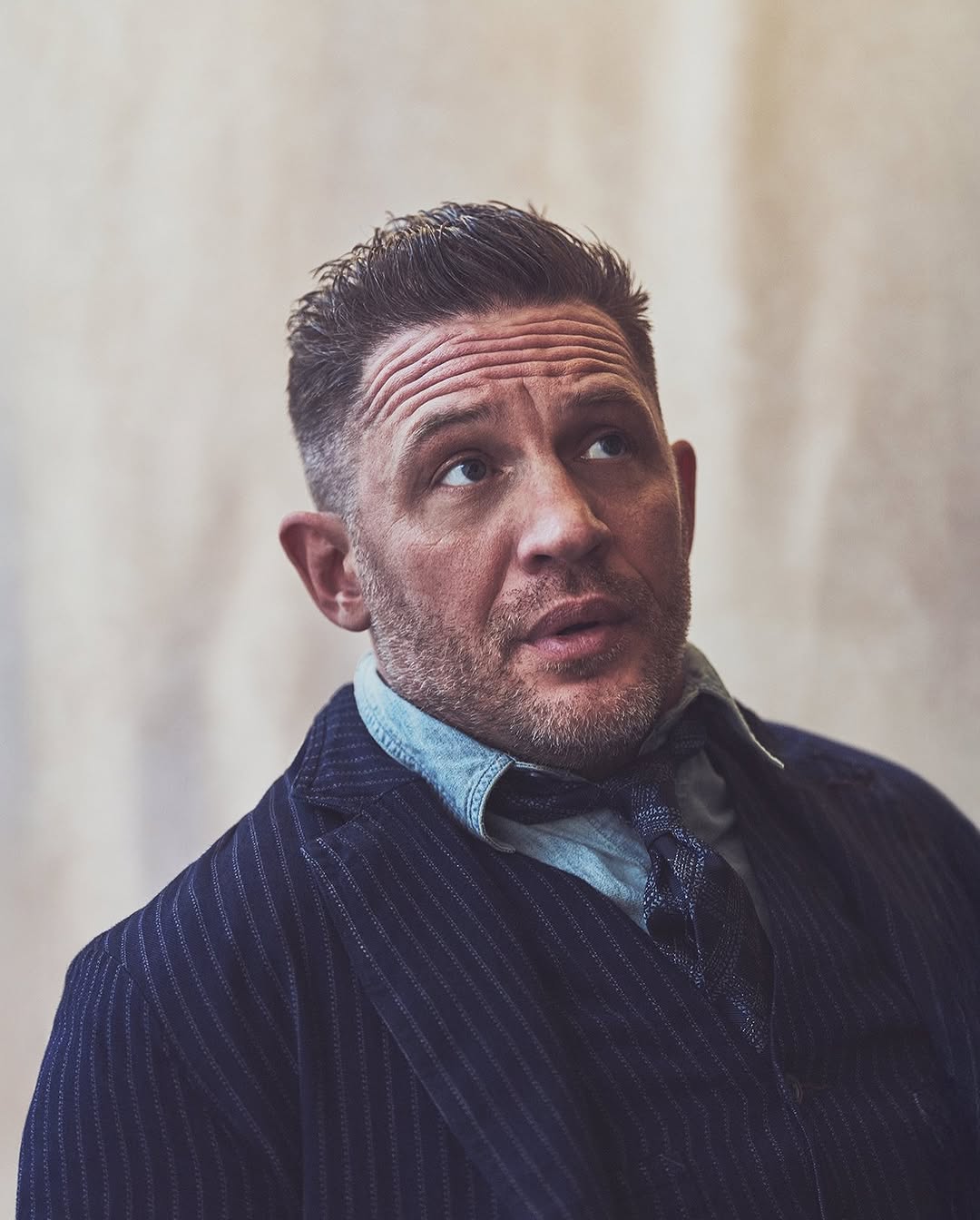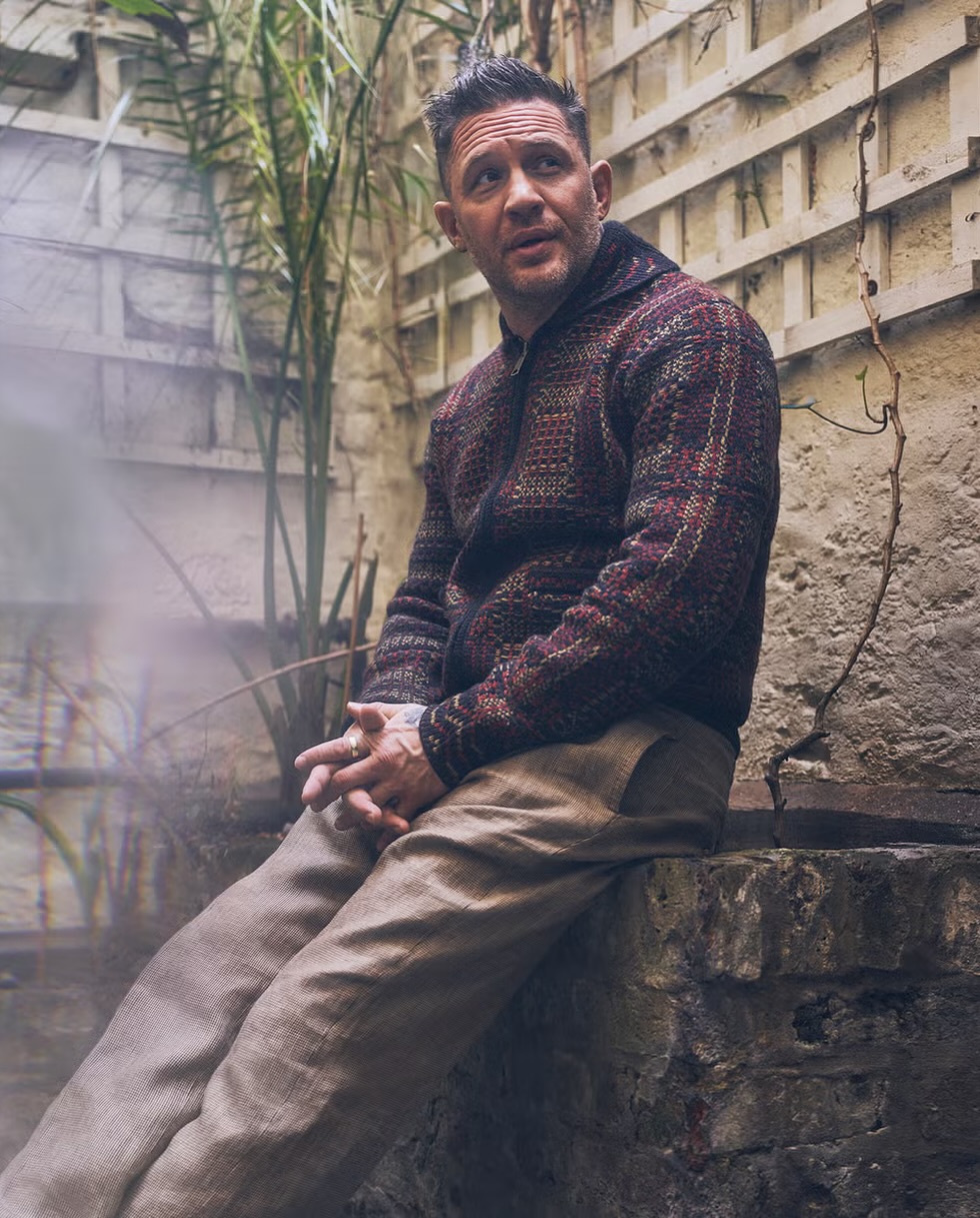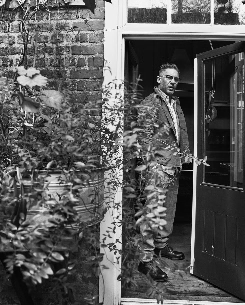 Съёмка разворачивается в камерных локациях: от безмолвных лондонских улиц до интерьеров, где шероховатая текстура пола и приглушённый свет вступают в диалог с одеждой Харди — костюмами с классической полоской, денимом и плотными фактурами. Образы актёра варьируются от расслабленно-небрежного до собранного и почти театрально выстроенного. При этом в каждом кадре сохраняется ощущение органичности — Харди никогда не разыгрывает, он существует внутри кадра.