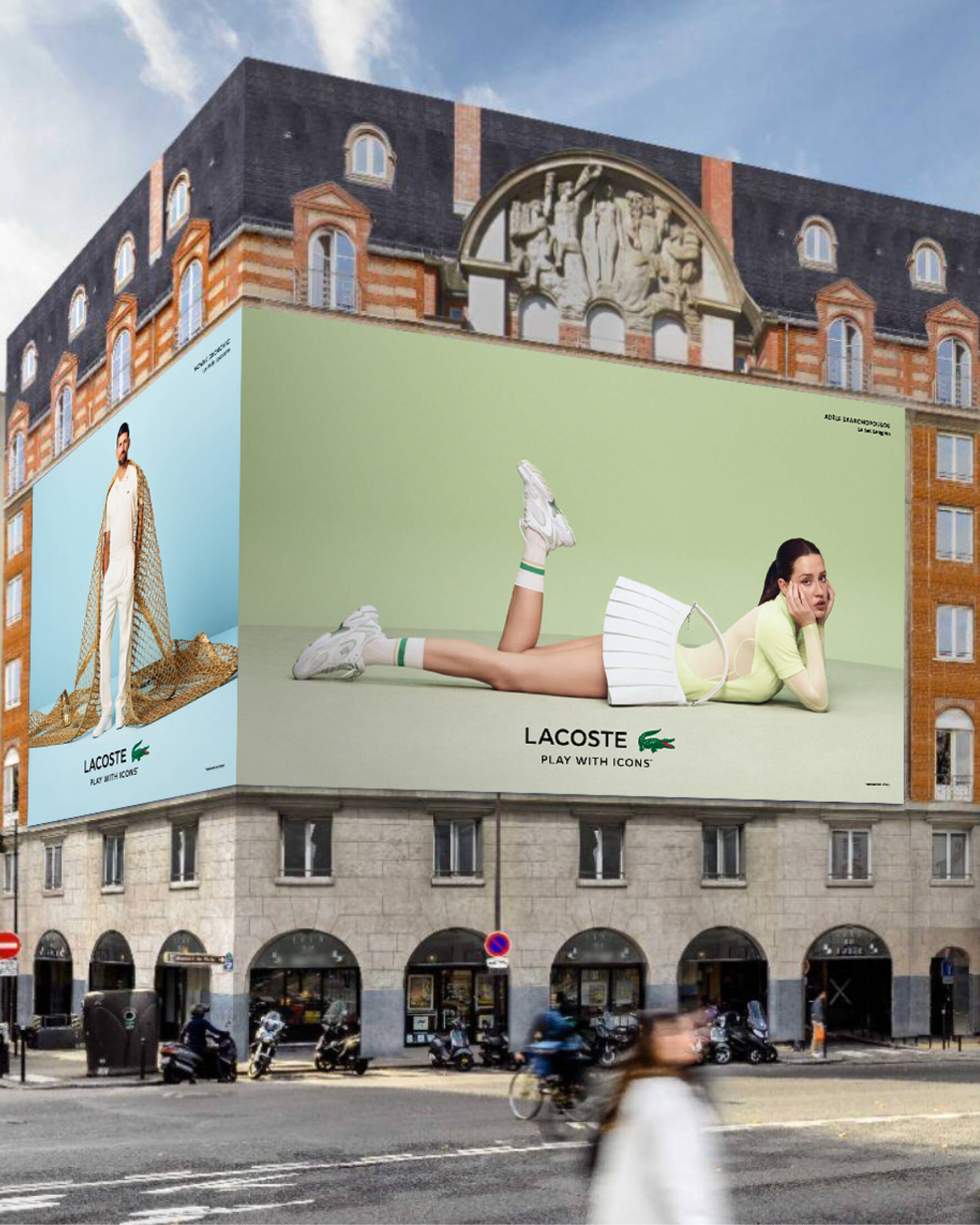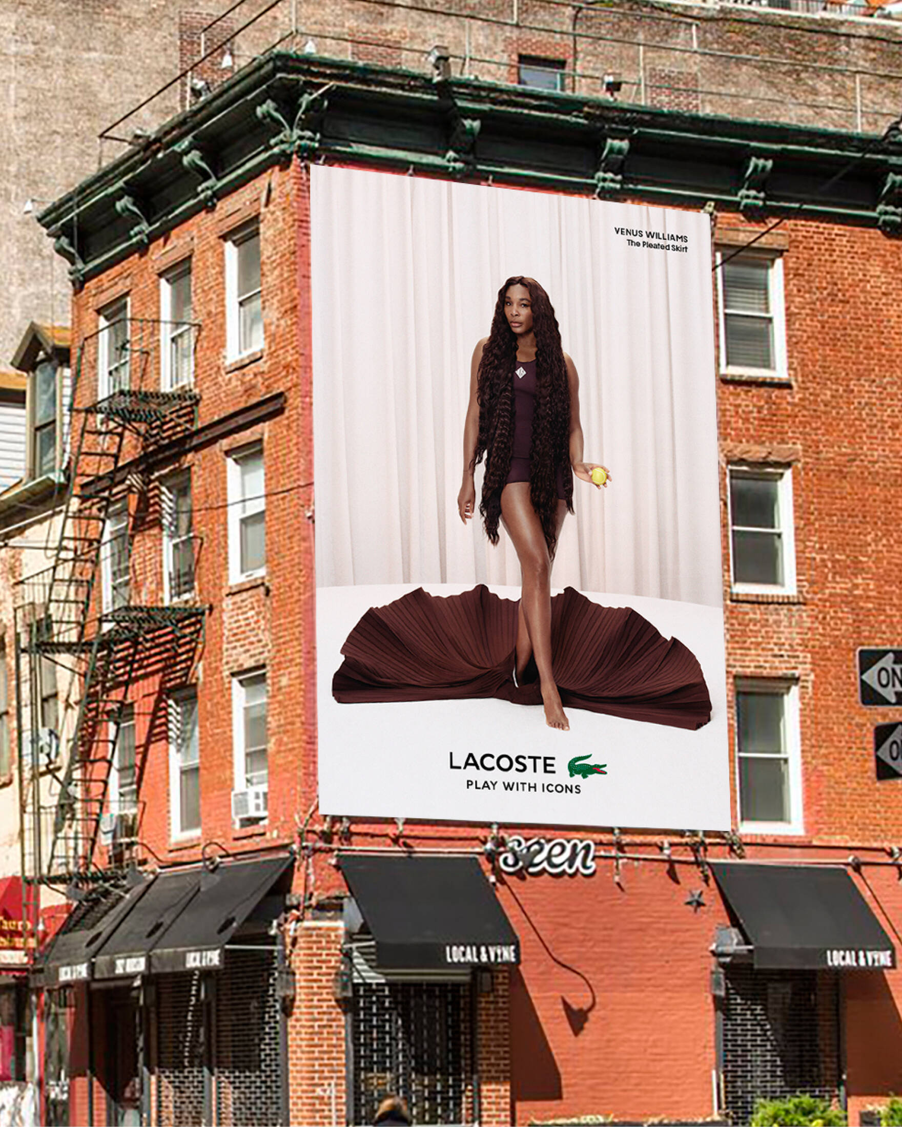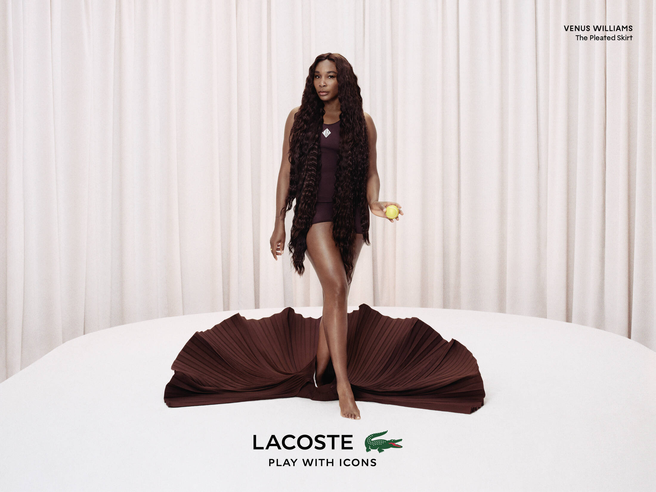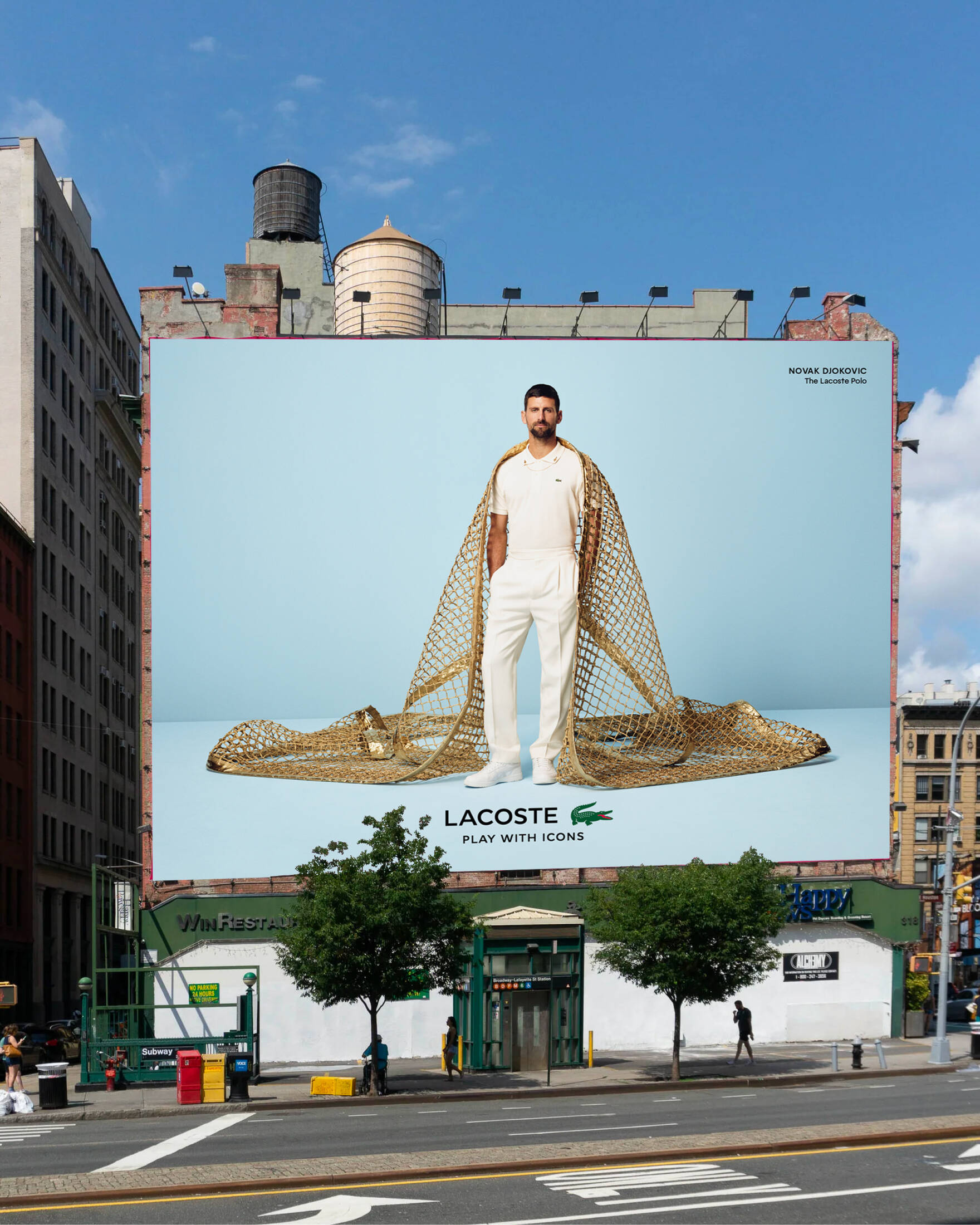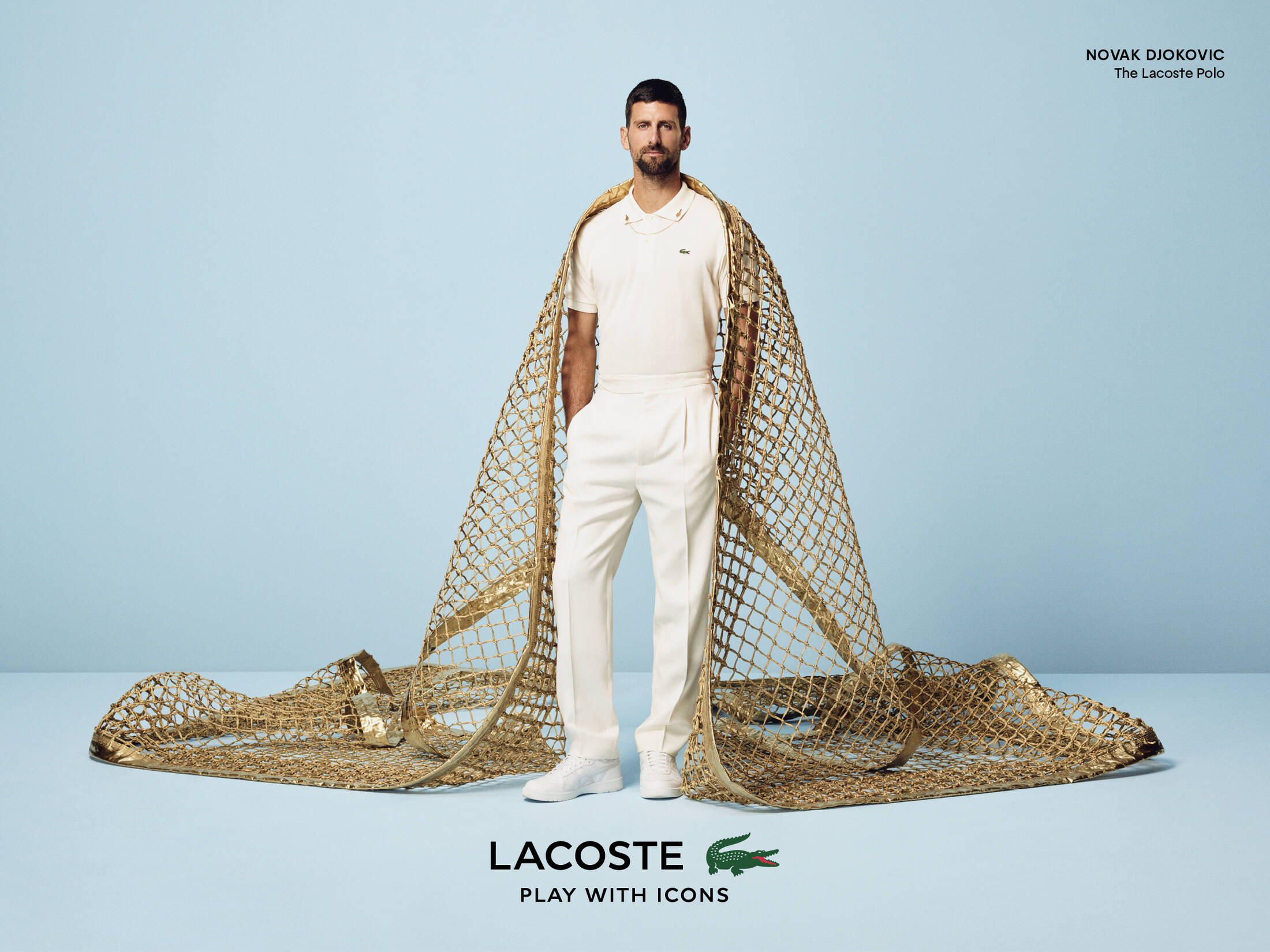 Креативная команда BETC Paris старалась подчеркнуть ключевые элементы бренда на фотографиях. Так, теннисный мяч в руках Винус Уильямс сделан из перламутра, сетка Новака Джоковича окрашена в золотой, а синий оттенок поло на Ване Ибо переливается с букетами цветов. Кампания Play With Icons стартовала во всем мире в мае 2025 г. в печатных изданиях, на телевидении, в цифровом формате и во флагманских магазинах Lacoste по всему миру. Плакаты с фотографиями звезд появились в наружной рекламе.