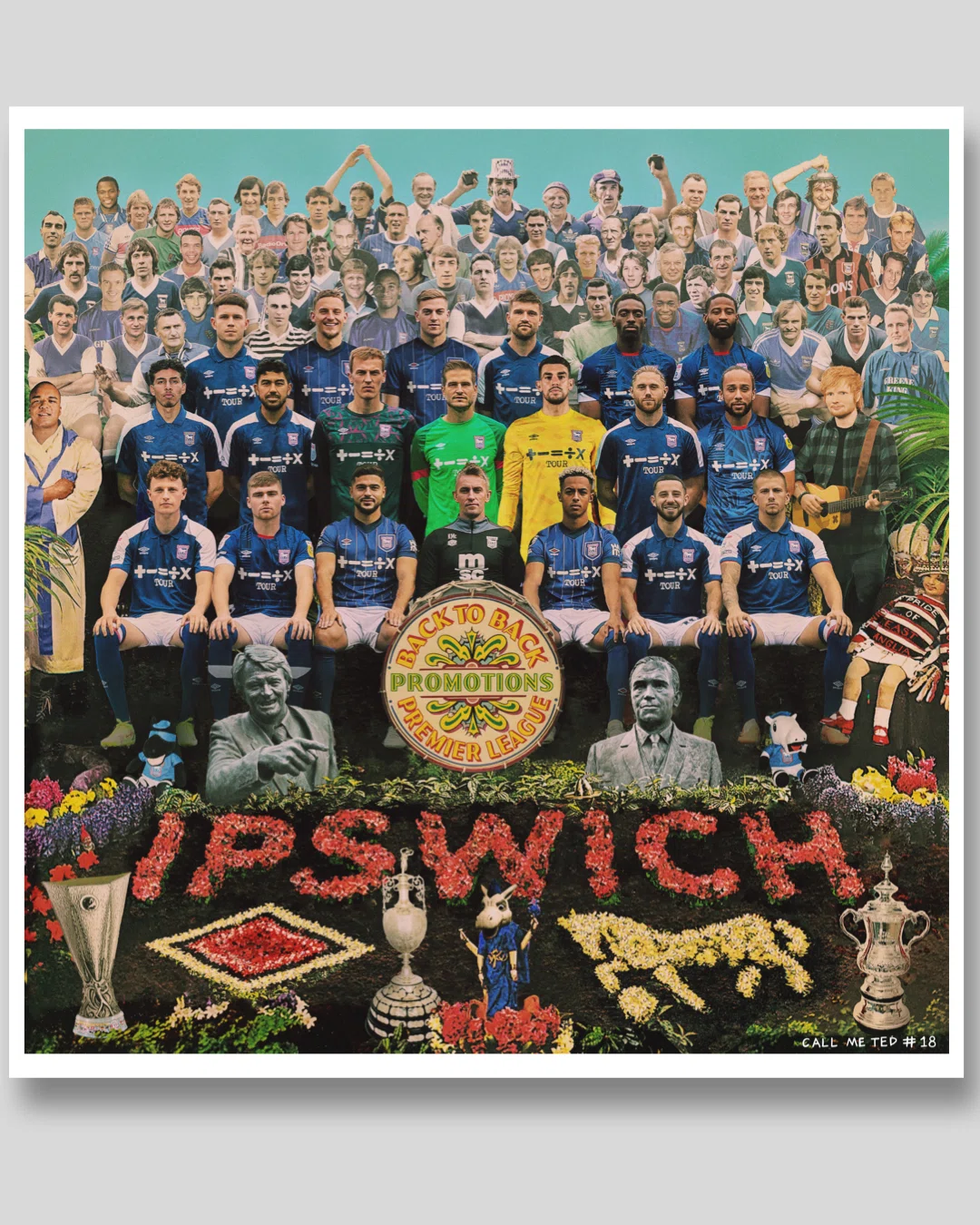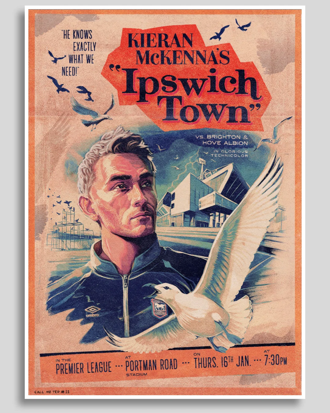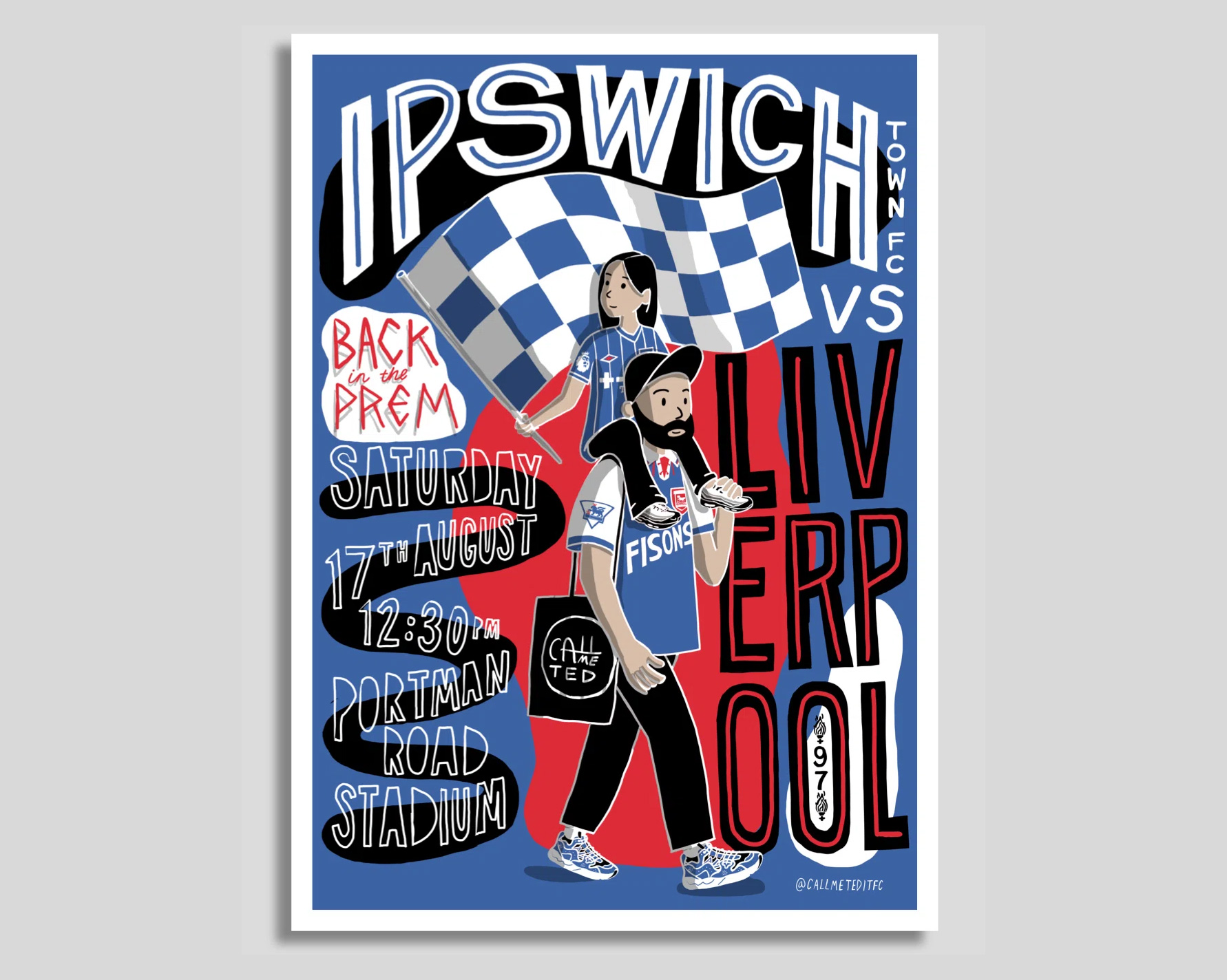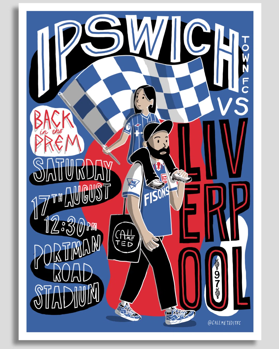 Когда футбольный клуб Ipswich Town вернулся в Премьер-лигу в 2024 году, братья Стивен и Ричард Хо прошли мимо традиционного фанатского мерча — и создали визуальный манифест футбольной культуры нового типа. Под названием Call Me Ted — в честь популярной кричалки на стадионе — проект объединил 19 художников для создания уникальных постеров к каждому домашнему матчу сезона.