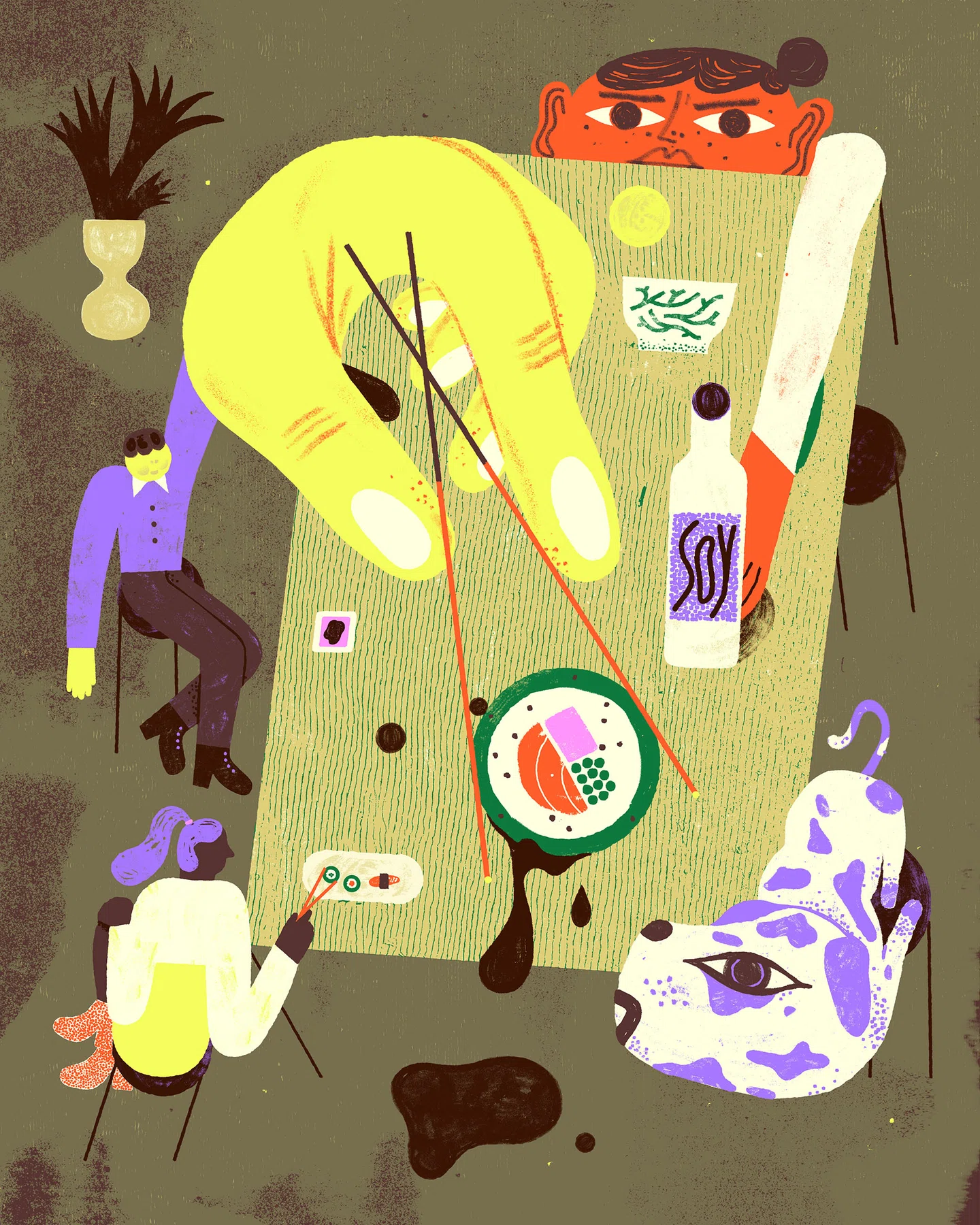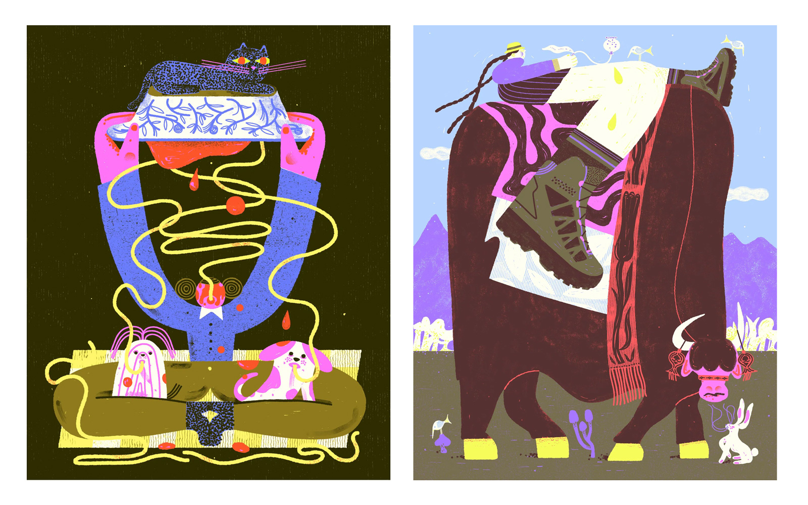 Иллюстрации Исакова одновременно игривы и созерцательны. Художник сознательно играет с масштабом: маленький всадник сидит на гигантском быке, яблоко размером с человека, а карамелизированные капустные листья парят, словно планеты.