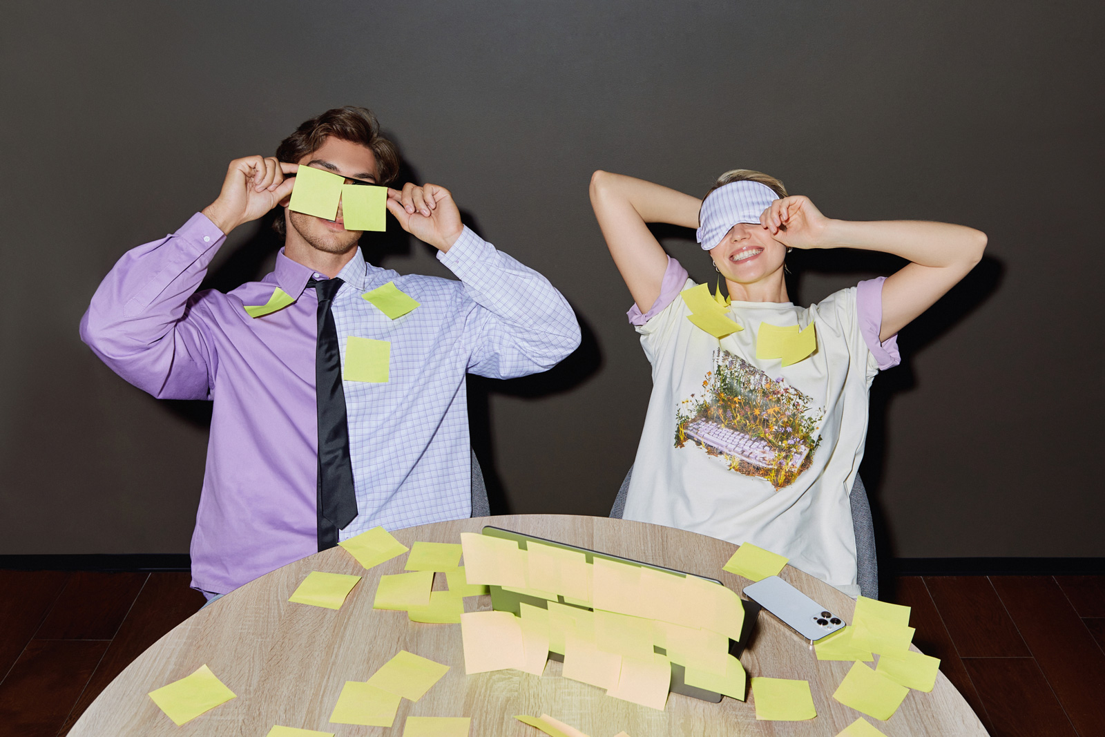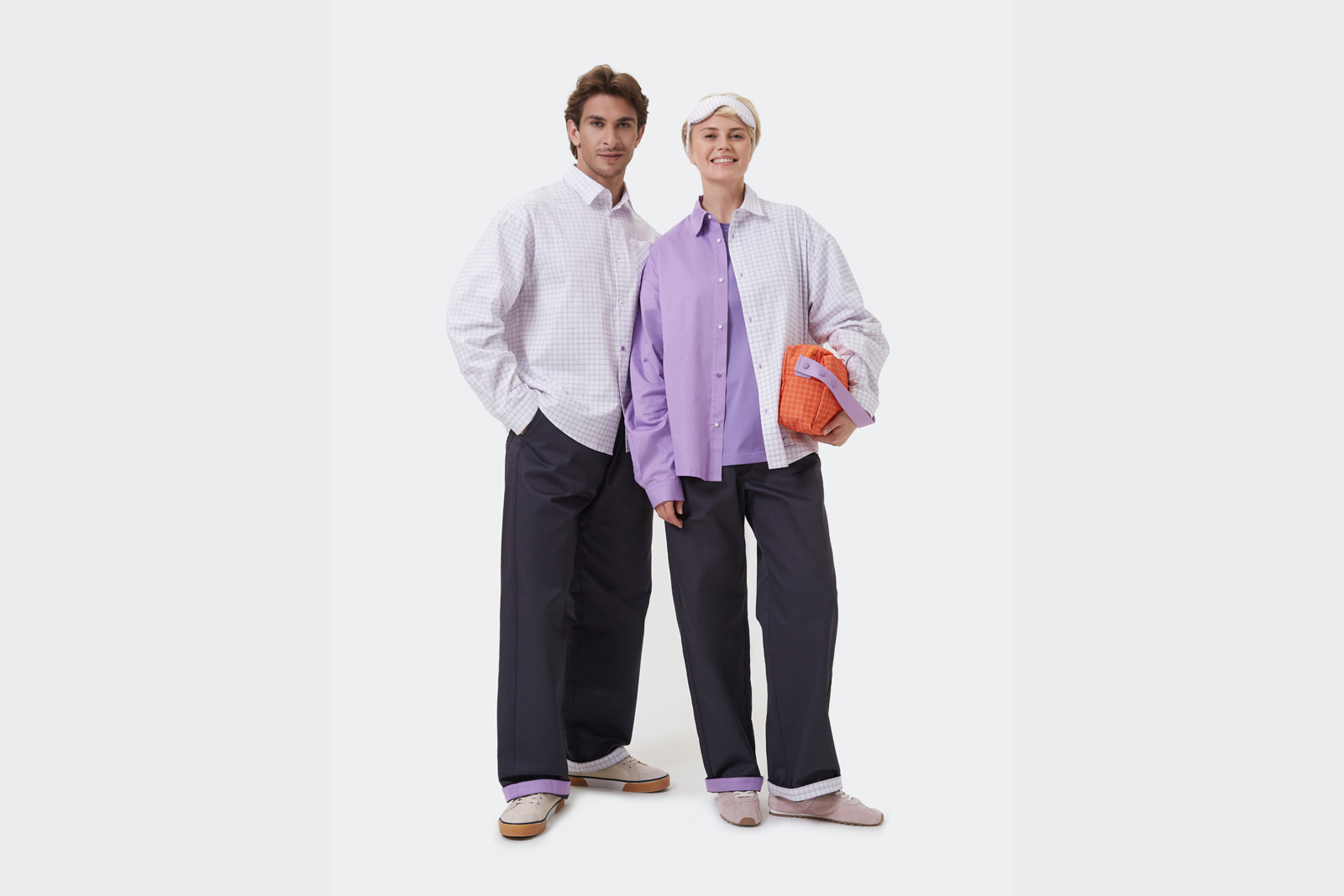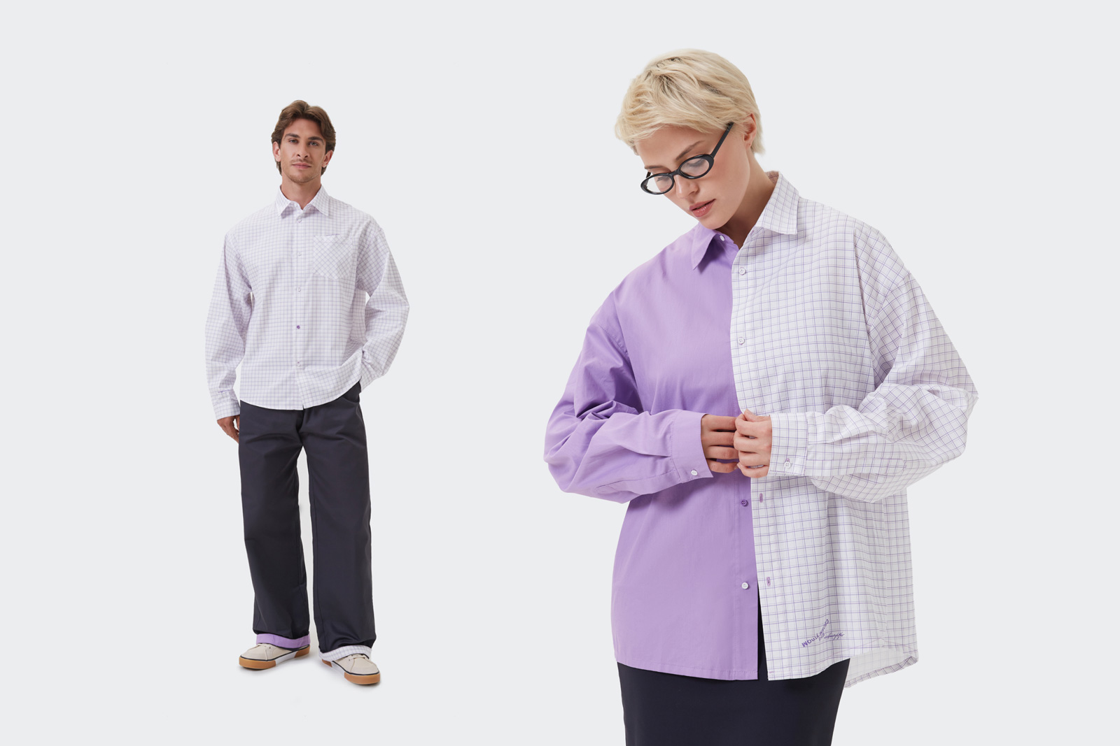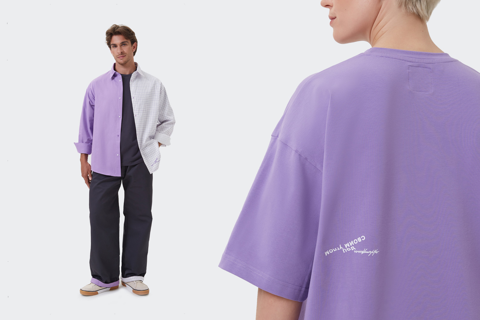 Одежда выполнена в духе офискор – эстетики делового и повседневного. В линейке – футболки с названиями команд, рубашки с ассоциативными метафорами, а так же пара ярких и функциональных аксессуаров. Отдельное внимание заслуживают брюки, которые впервые появились в «Универмаге» – с поясом на завязках и двумя вариантами ростовок.