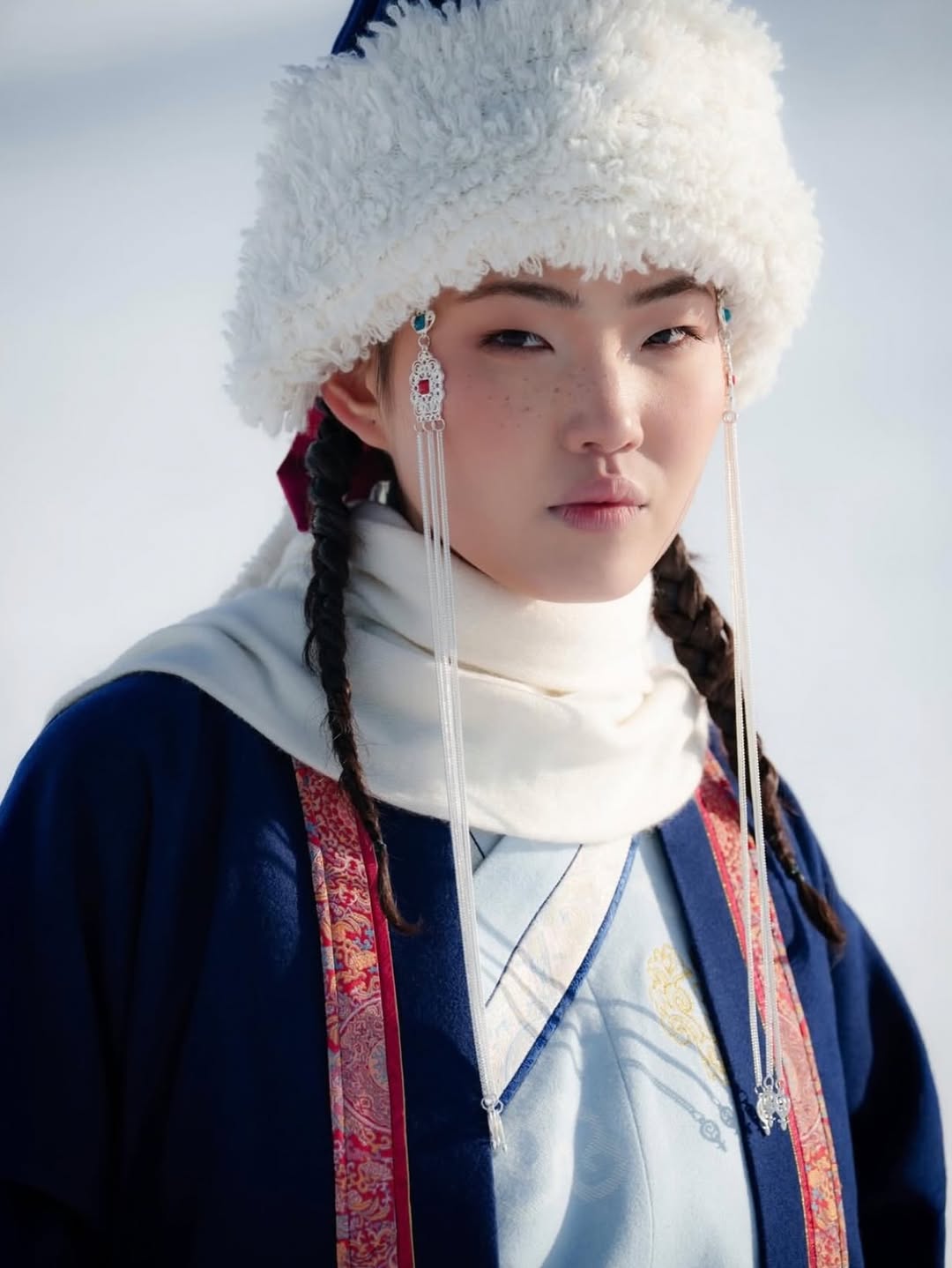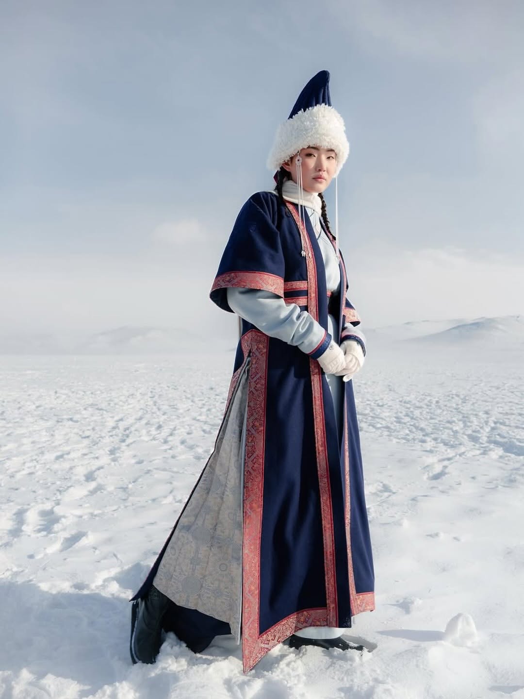 В основе образа — переосмысление традиционного дээл: силуэт сохраняет архитектурную строгость и вертикальную собранность, характерную для монгольской одежды, при этом пропорции и конструкция адаптированы под современные требования парадной формы. Орнаментальные элементы и отделка отсылают к эпохе кочевой аристократии, но не скатываются в реконструкцию — это скорее аккуратная цитата, встроенная в современный контекст.