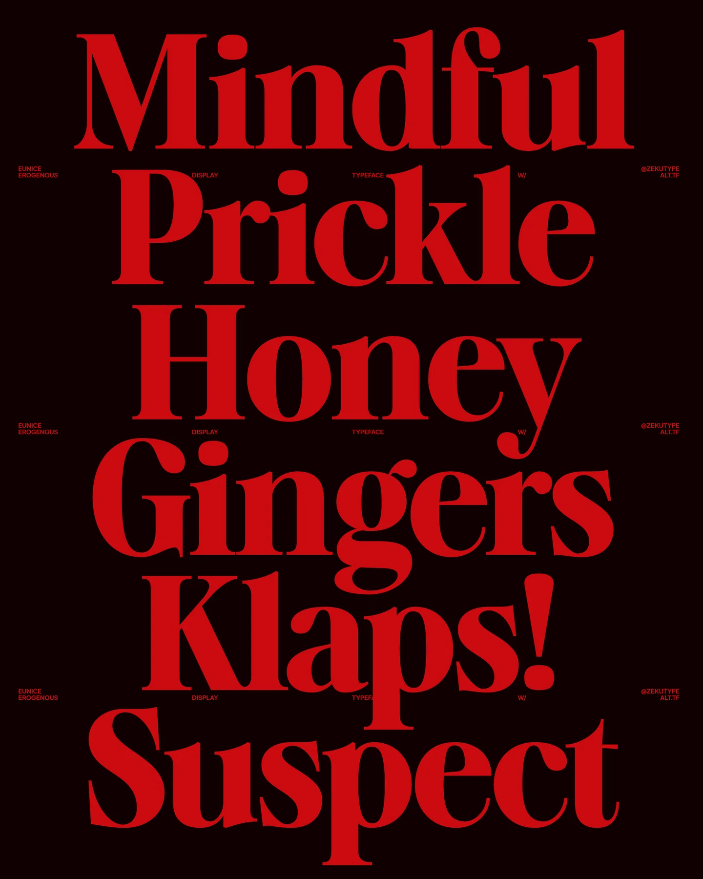 ALT Erogenous — это смелый декоративный шрифт с засечками, который сочетает резкий контраст с соблазнительными изгибами. Разработанный для привлечения внимания, его выразительные буквы отличаются выраженным контрастом штрихов, чувственными засечками и прочной базовой структурой, вызывающей визуальное напряжение и интригу.